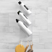 Easy to install, wall mounting glue application Shower Rack for extra large bottles. The shelves hold 3 XL size bottles, with space on the hanging hooks for 2 razors or flannels and hanging items. Made from quality blue tint clear plastic. Easy to remove or relocate without causing any damage to walls.