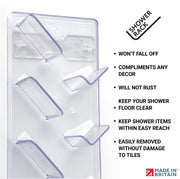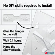 Easy to install, wall mounting glue application Shower Rack bathroom organiser caddy. Holds 4 bottles, 2 razors, flannels and hanging items. Made from quality blue tint clear plastic. Easy to remove or relocate without causing any damage to walls.